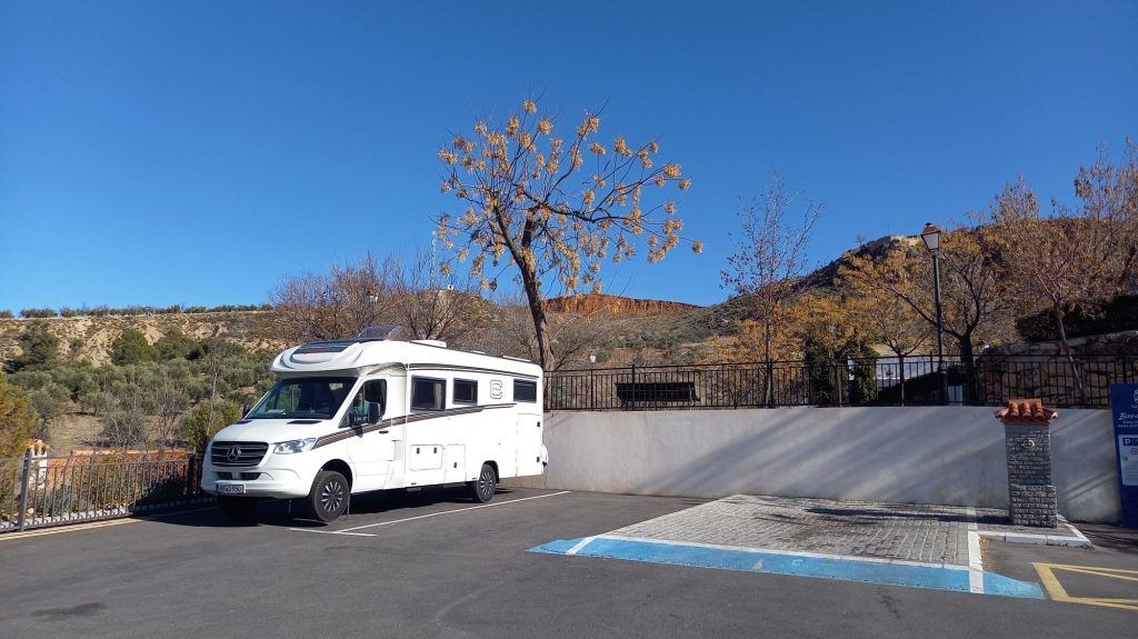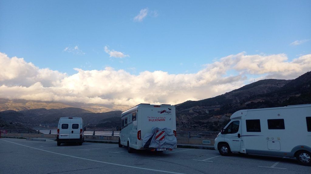 Das rechte WoMo gehört übrigens einer allein reisenden Frau aus Schweden Lappland mit ihrem Hund. Sie fährt allerdings noch vor Einbruch der Dunkelheit nach Granada, wo sie einen Stellplatz reserviert hat.