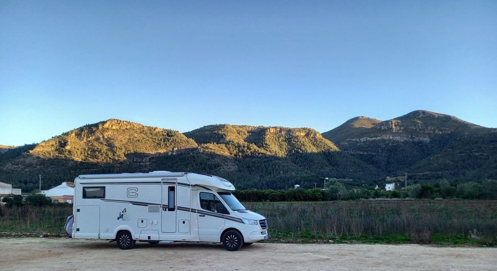 Unser Stellplatz für heute Nacht, im Hintergrund das Kloster Reial Monestir de Santa Maria de la Valldigna.