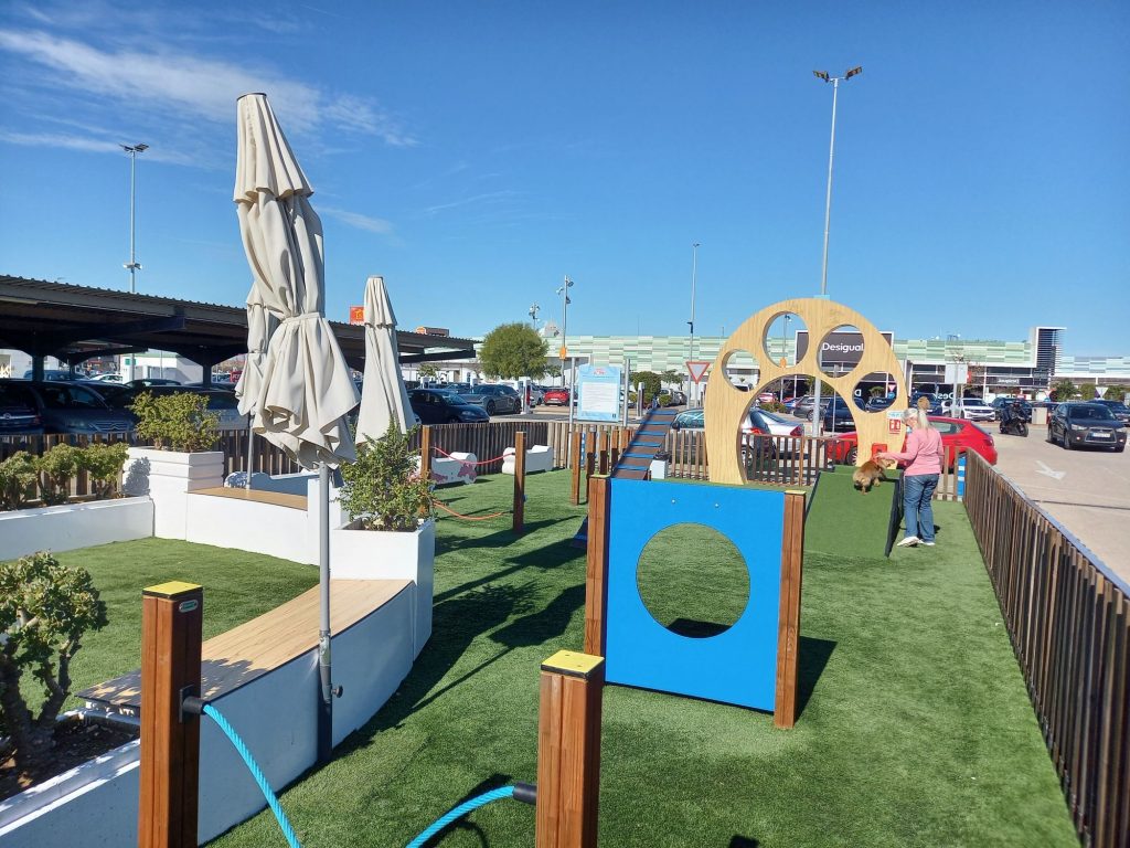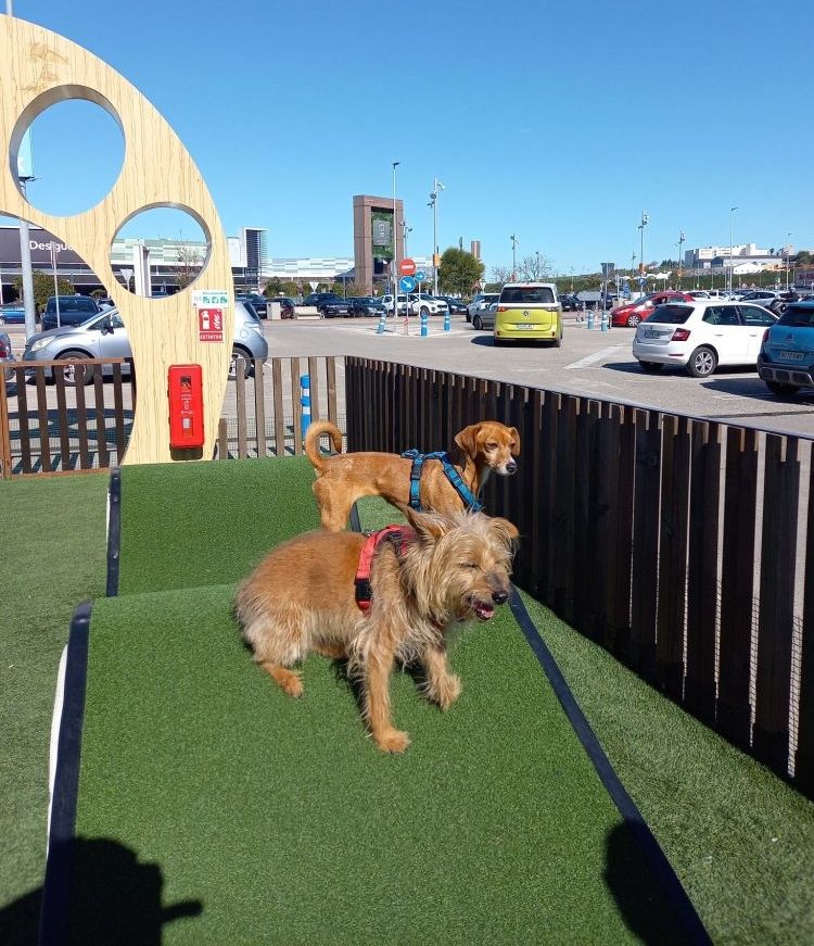 Nach dem Frühstück gehen wir mit Benni und Milla auf den Hundeplatz inmitten des Einkaufszentrums: