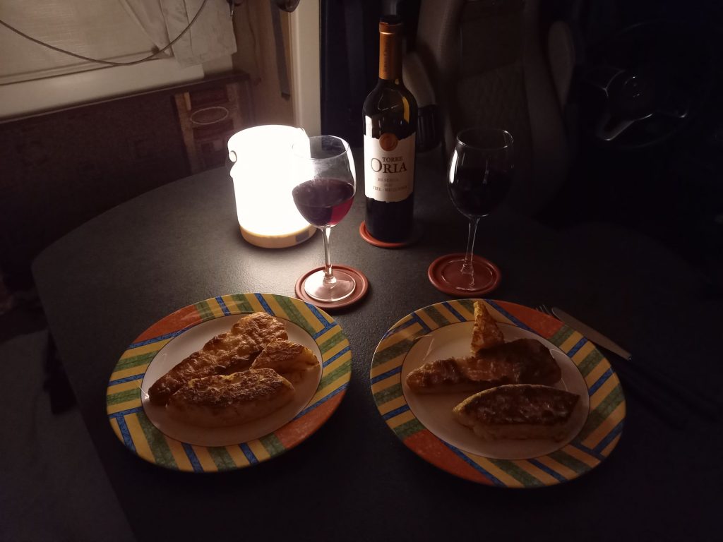 Nach knapp 2 Stunden sind wir zurück am WoMo – soviel zum Thema Ruhetag 😂. Wir machen uns eine halbe Tortilla warm, dazu ausnahmsweise Fisch und einen leckeren Rotwein 🍷😇.