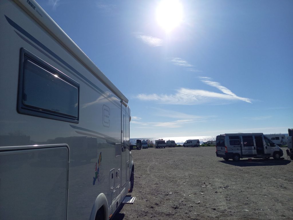Eine halbe Stunde später stehen wir wieder auf dem illegalen aber anscheinend geduldeten Platz. Etwas weiter hinten, aber mit Blick aufs Meer.