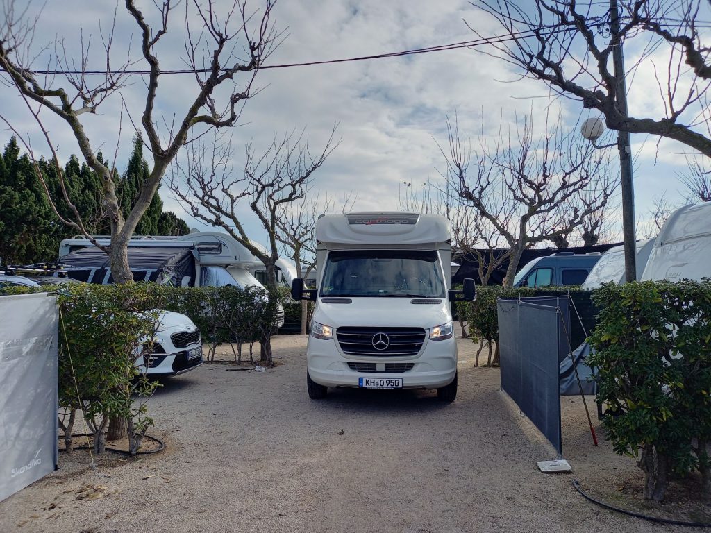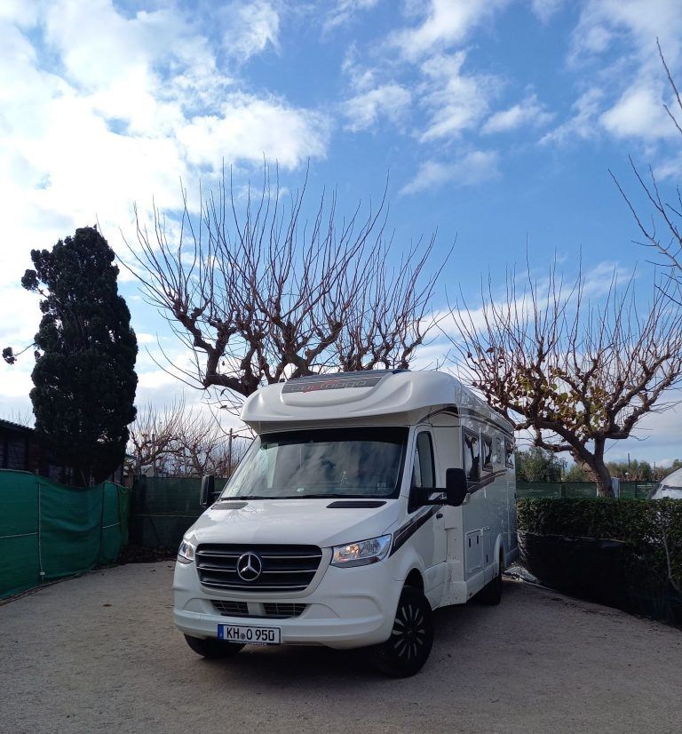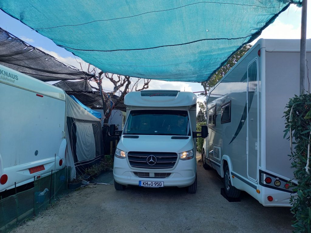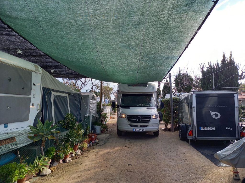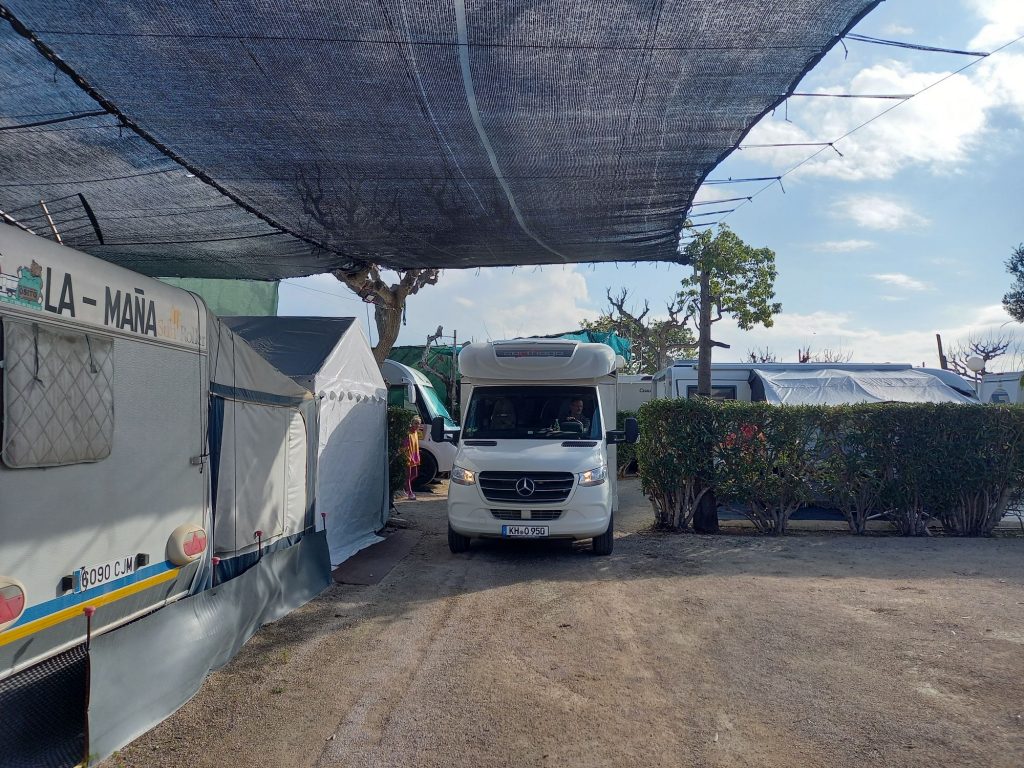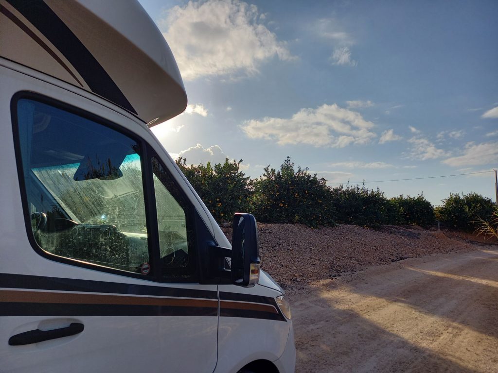 Eigentlich wollten wir in die Berge nach Guadelest, aber da sieht es schwer nach Regen aus. Also weiter auf der Autobahn und nach Elche Abfahrt zu einem privaten Wohnmobilstellplatz etwas abseits vom Meer. Der Weg führt uns diesmal an riesigen Zitronenplantagen vorbei und am Schluss auch mittendurch 😀.