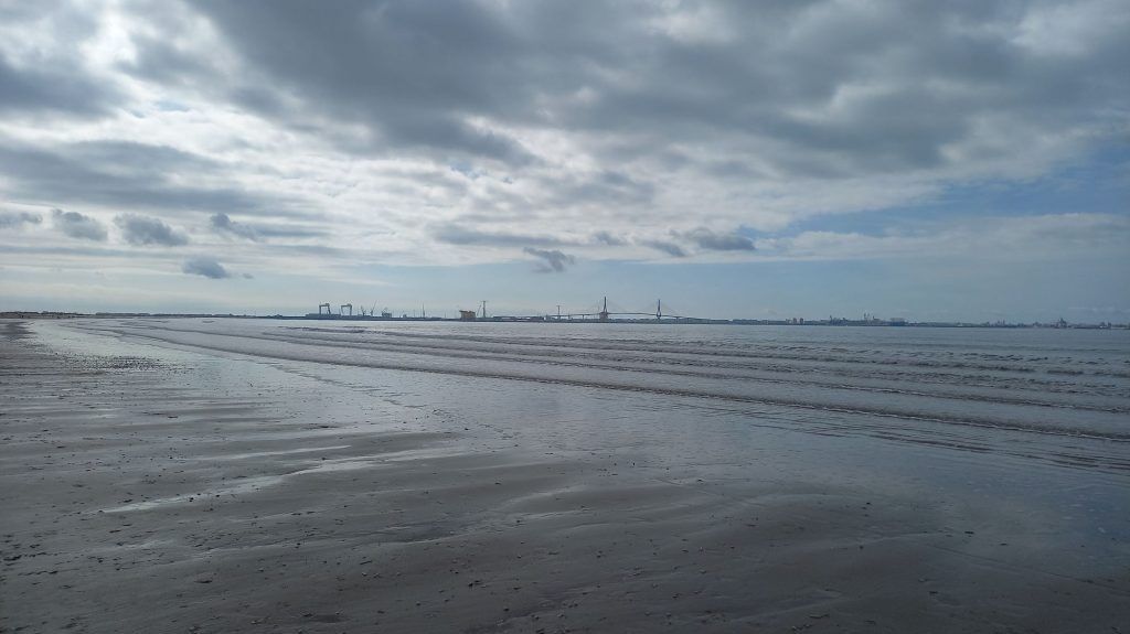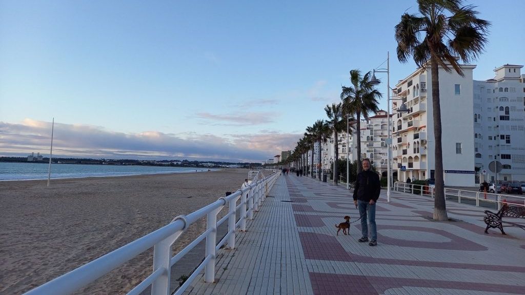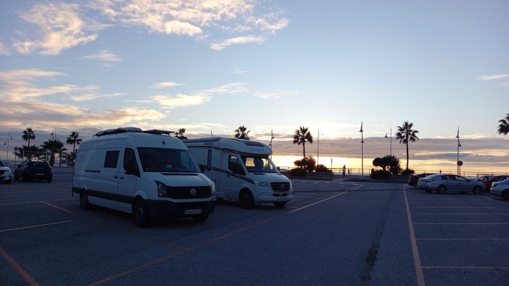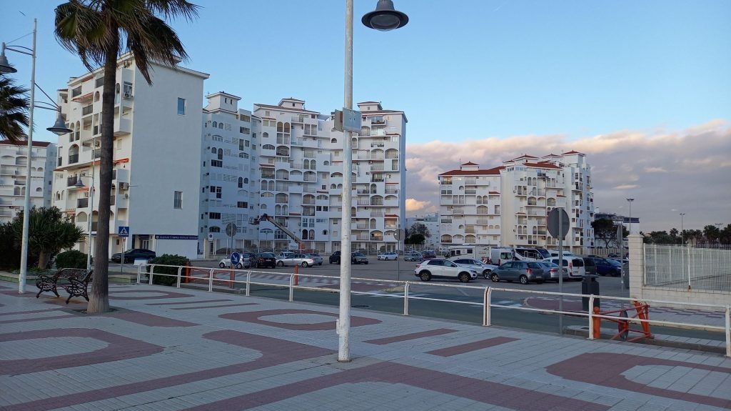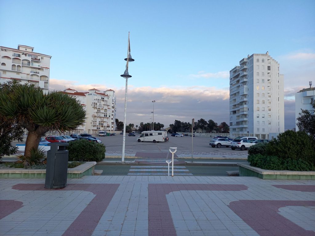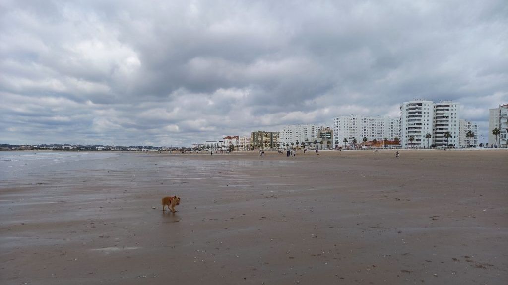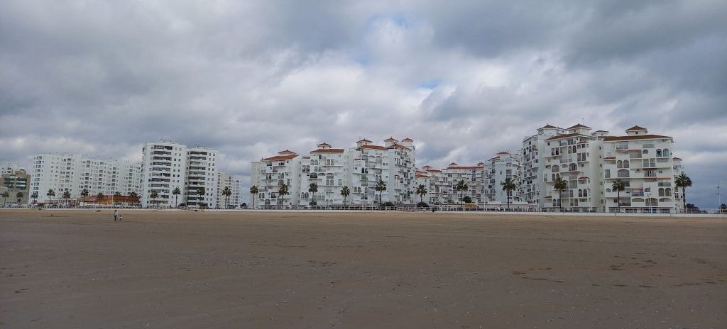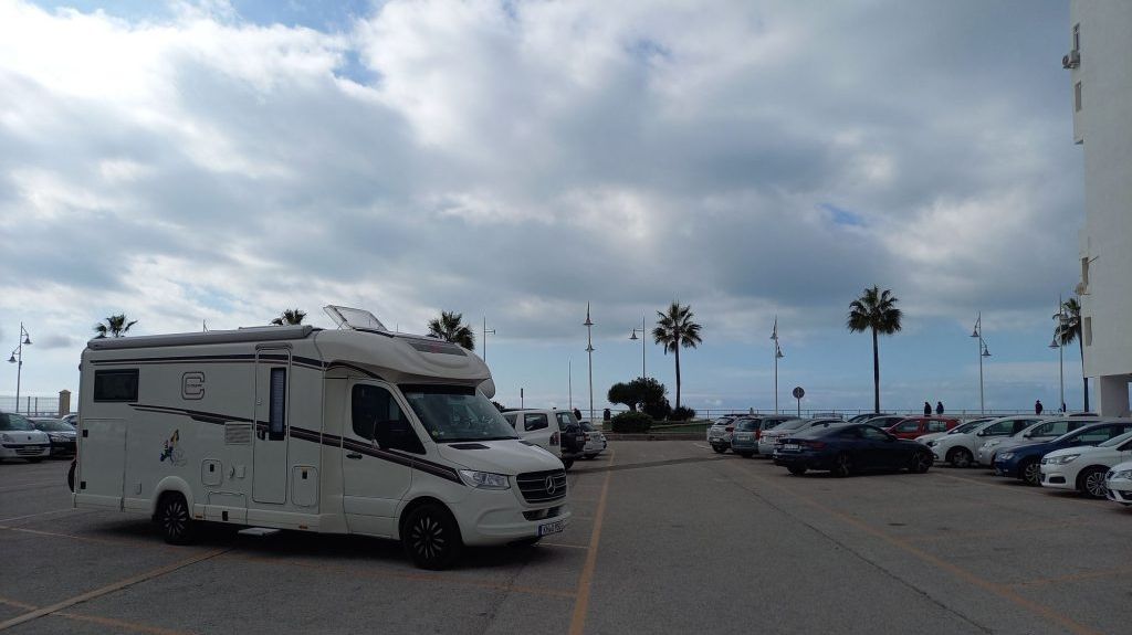 Wir stehen inmitten großer Apartmenthäuser an einer tollen Promenade (das können die Spanier 👍😀) und einem herrlich breiten langen Sandstrand mit Blick auf Cadiz.